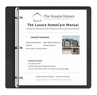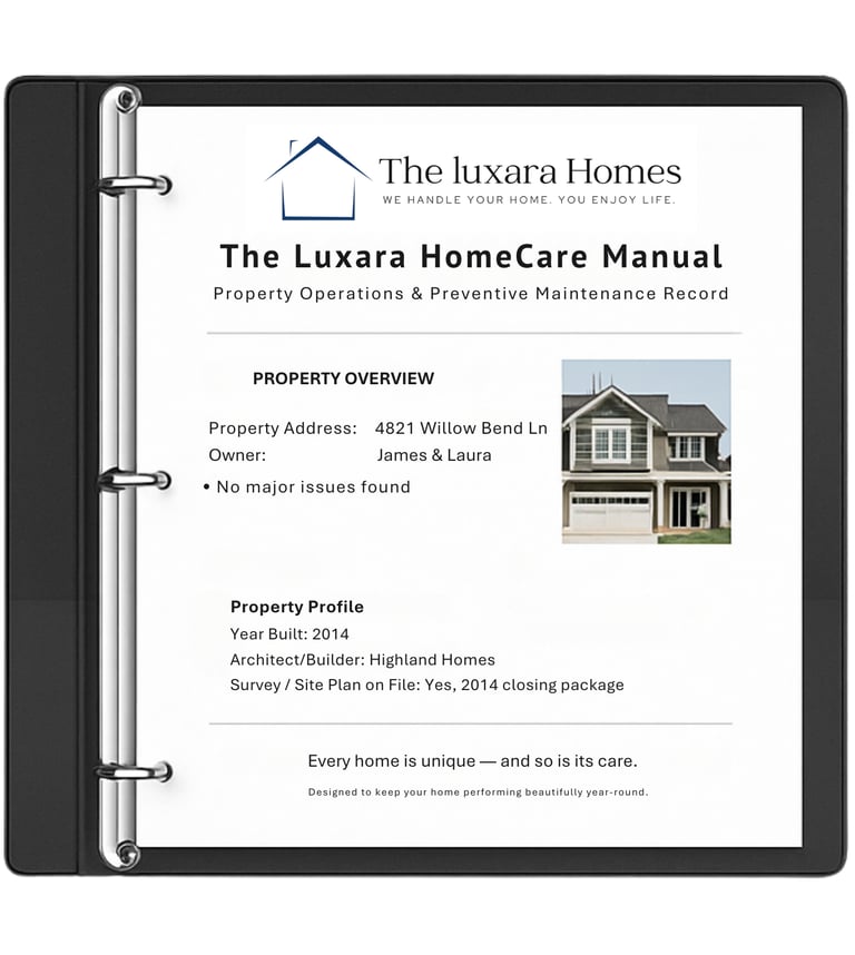 Every Luxara membership begins with the creation of your personalized HomeCare Manual — your home’s detailed guide of systems, components, and maintenance procedures.